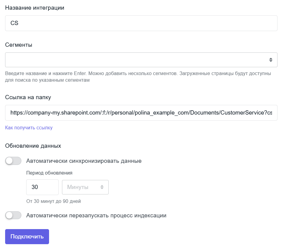 Интеграция позволяет загружать данные из папки Microsoft OneDrive в базу знаний, автоматически синхронизировать и переиндексировать их.