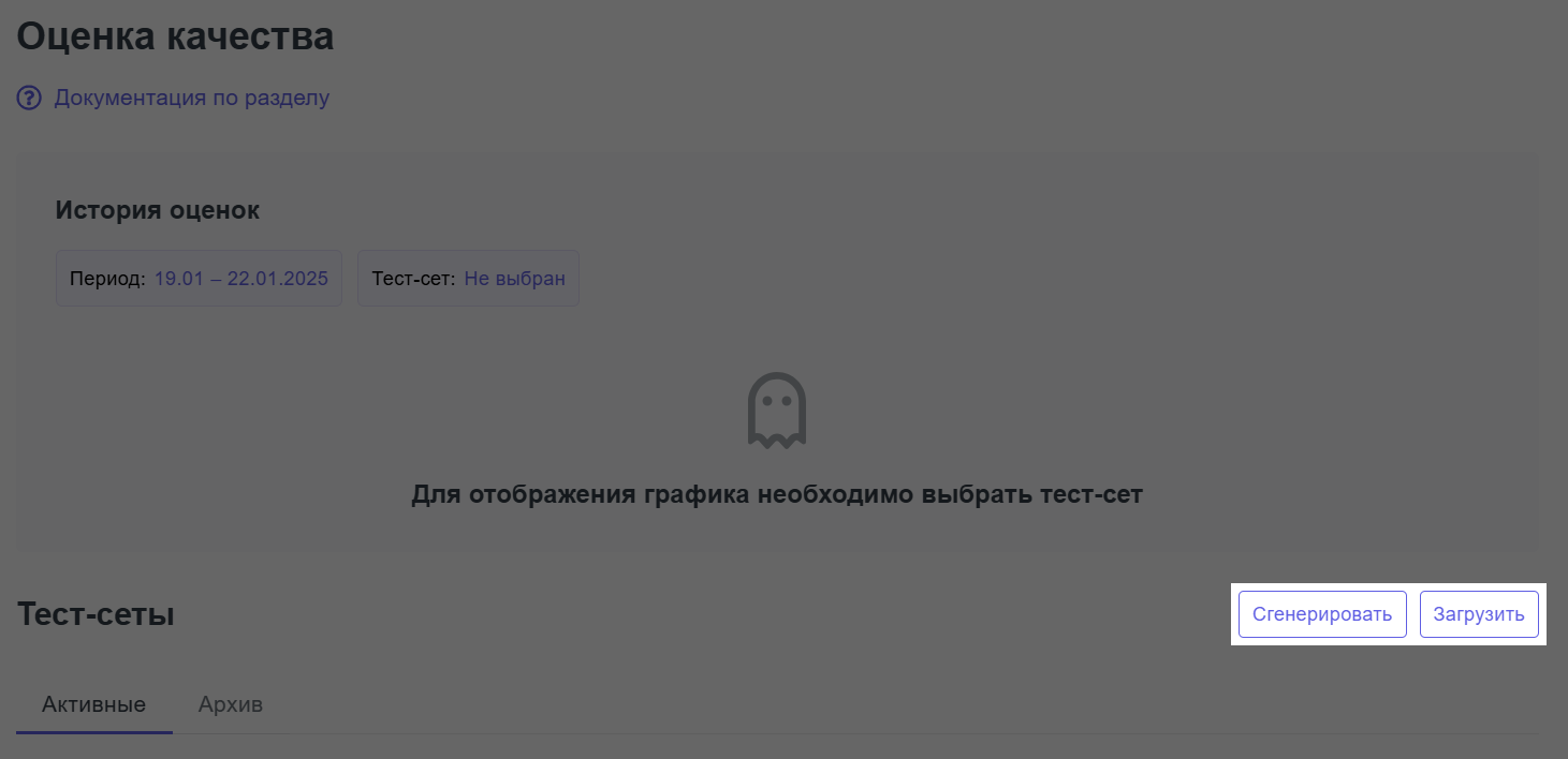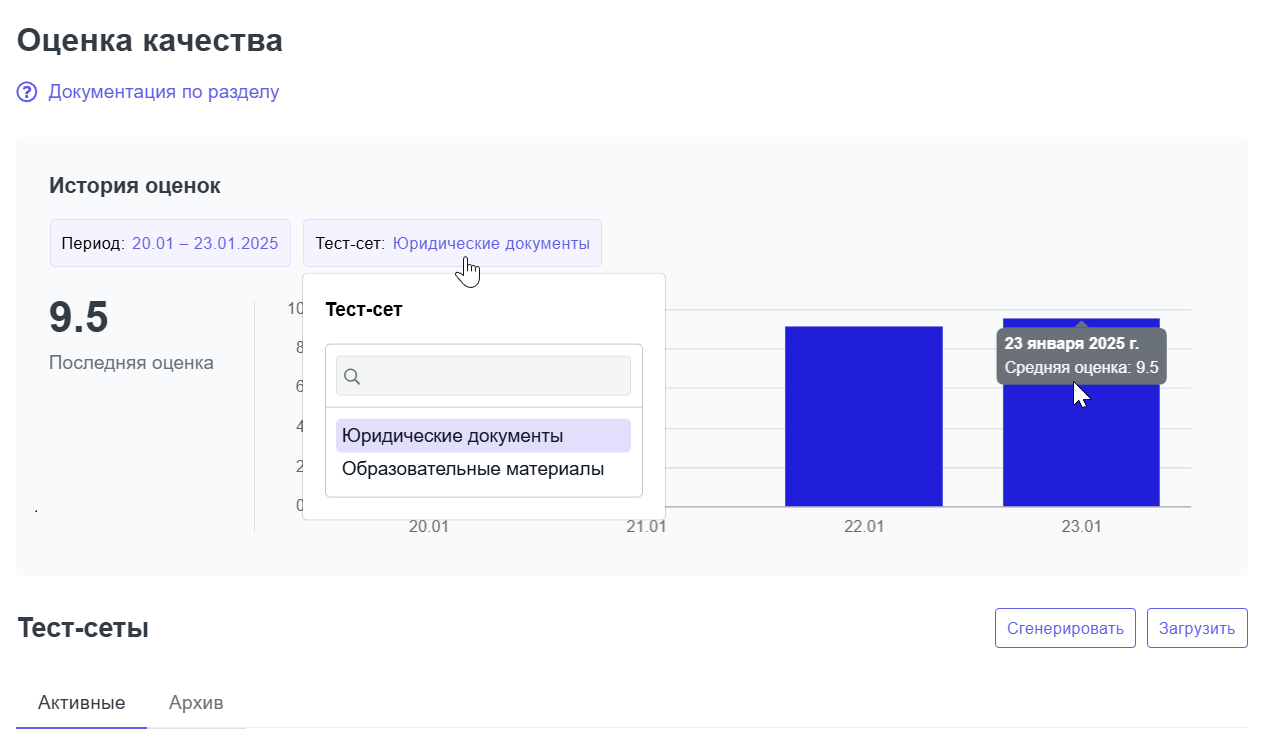 Чтобы посмотреть график, в блоке История оценок выберите нужный период и тест-сет.