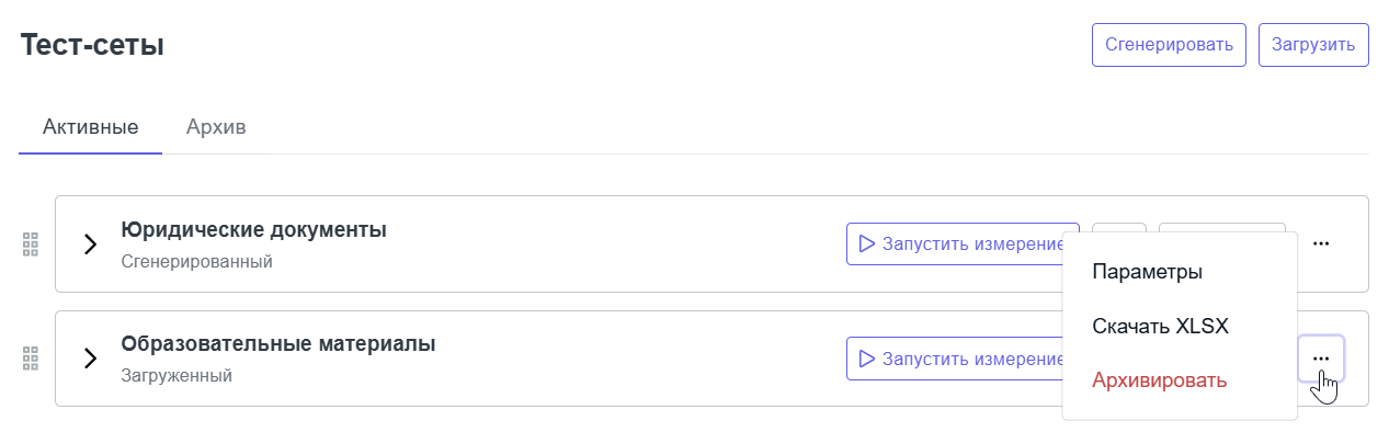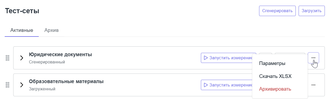 Чтобы посмотреть список измерений, в строке с тест-сетом нажмите .