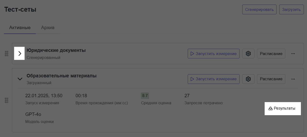 Чтобы скачать подробный отчет с оценками по каждому вопросу из тест-сета, нажмите в строке с тест-сетом, а затем нажмите Результаты для интересующего вас измерения.