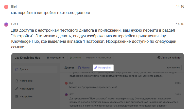 По умолчанию поиск по базе знаний не учитывает содержание изображений — только текст вокруг них. Для поиска по изображениям включите в настройках проекта генерацию описаний изображений и переиндексируйте базу знаний. Эти описания будут использоваться для поиска и подготовки ответа наряду с текстом документа.